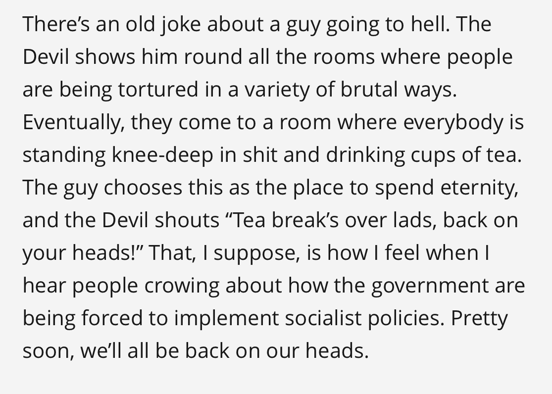 - I think that’s what he’s saying too. Almost like satire. How this capitalist system can capitalize on such socialist measures. You all are on the same side.monospaced