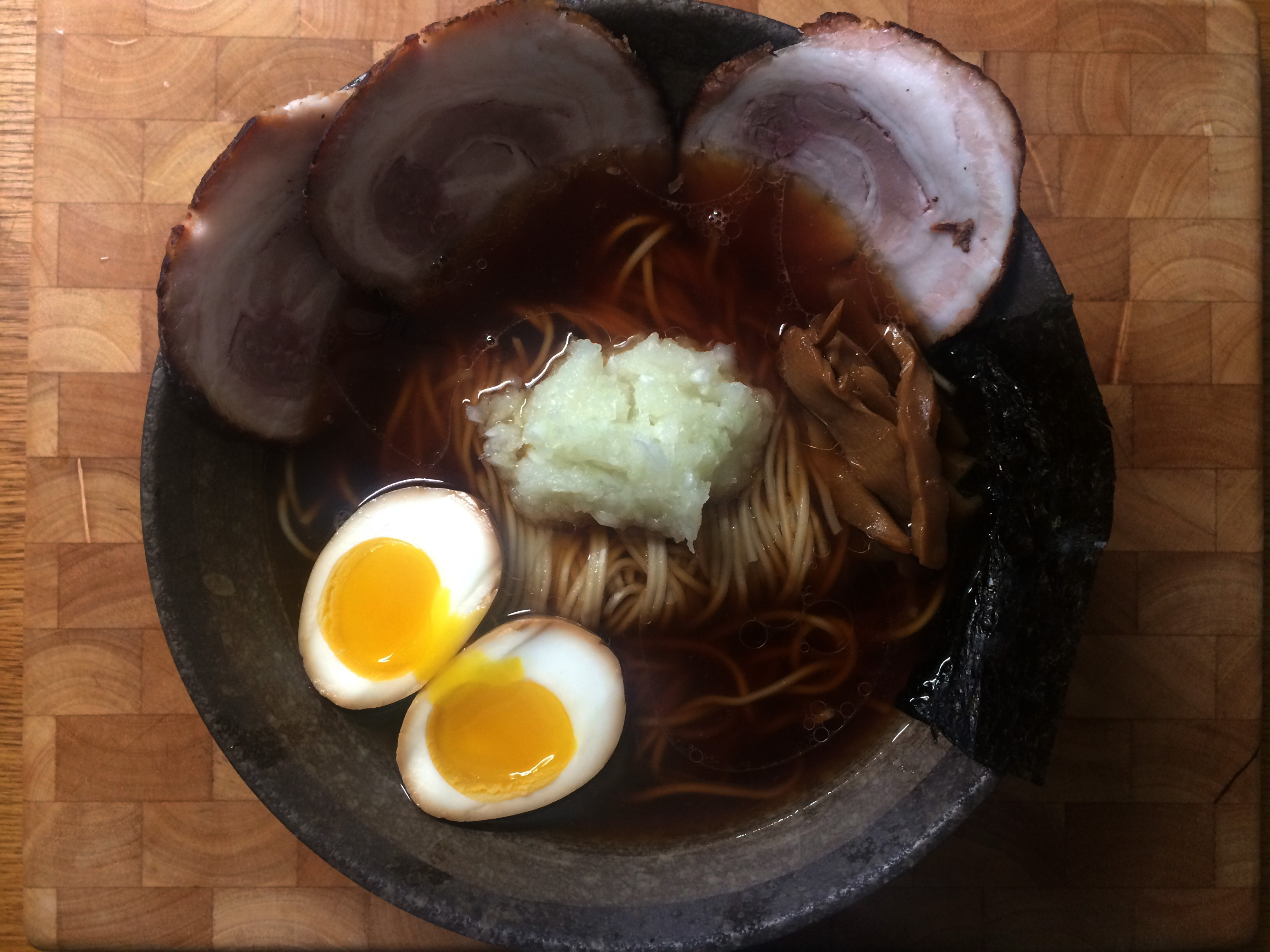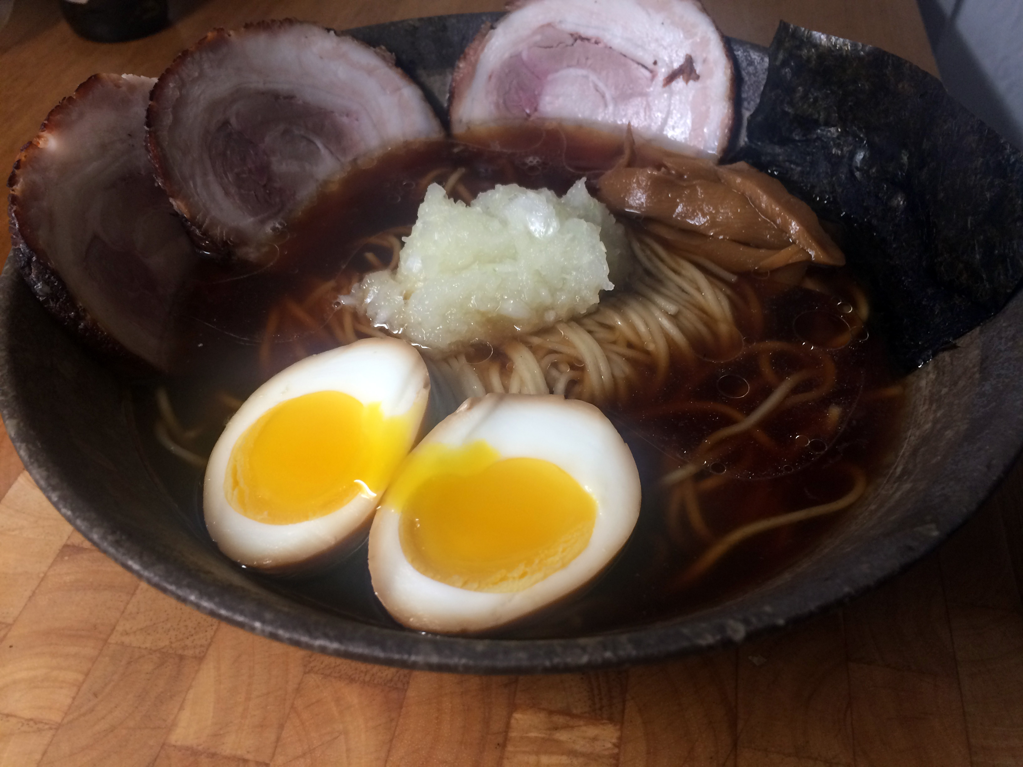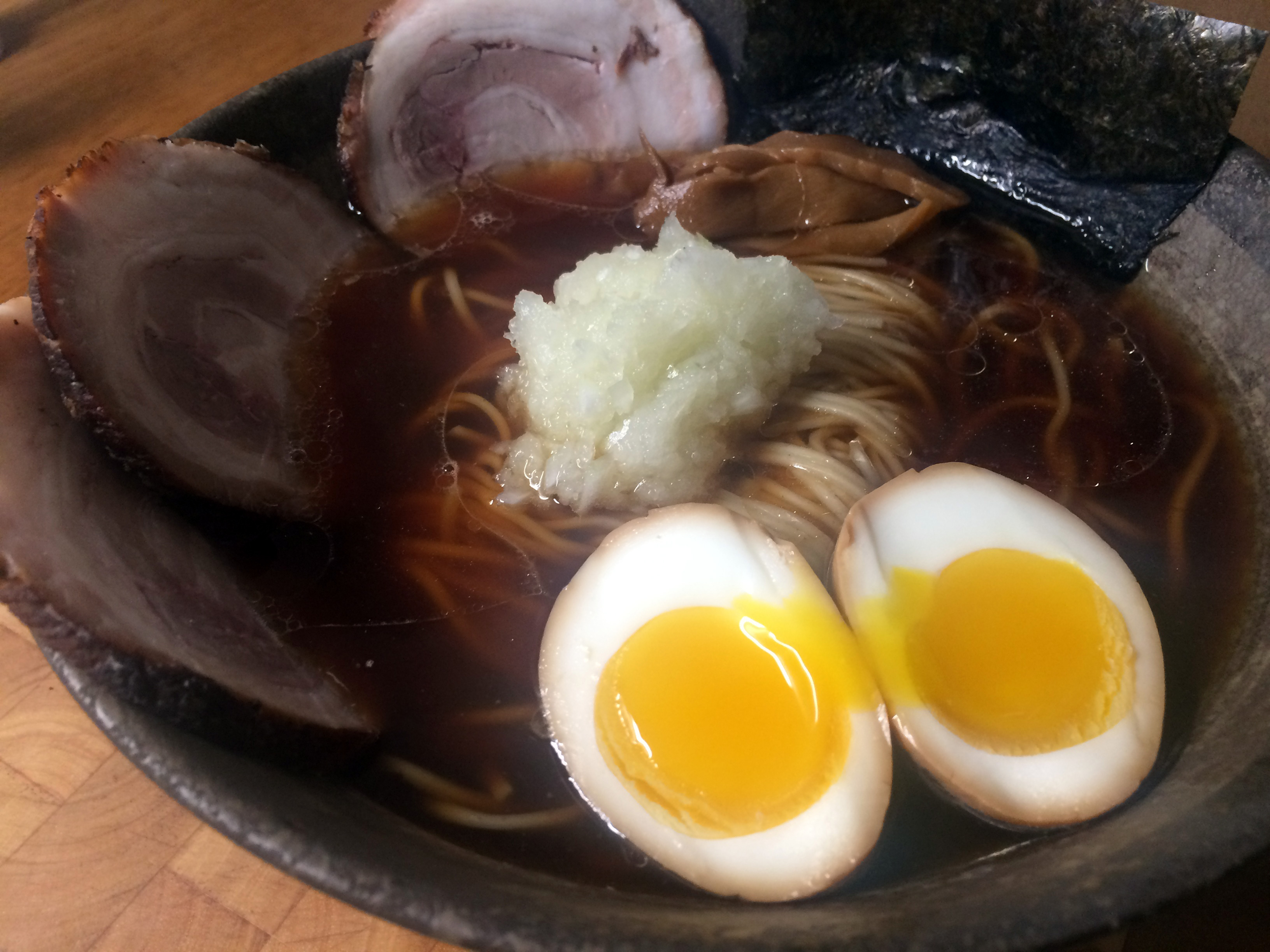 Hachioji is similar to the stereotypical sort of Tokyo shoyu ramen in that it's a clear chintan broth (in my case, 2:1 pork to chicken) seasoned with a shoyu tare.