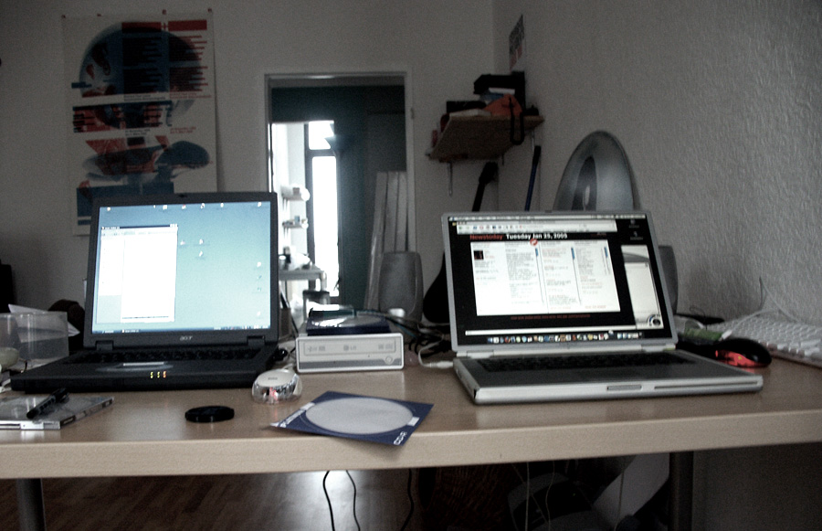 the bloke next to me (more of a programmer type) has all his tapes and documents neatly stacked, not a paper out of place. i've got magazines, drawings, books, cds, overdue digibeta tapes, pens, notes to self, various bits of visual stuff that i've collected, magpie-like, for no real purpose. every now and then i like to throw some crap onto the tidy blokes desk or tap biscuit crumbs into his keyboard just to drive him mentalist. does that make me a bad person?