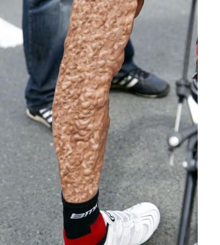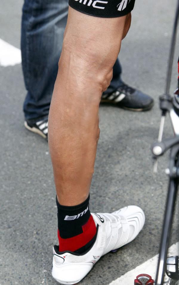 - he just has varicose veins, in combination with cycling and age gives this, armstrong has that too but not as prominentdrgs
