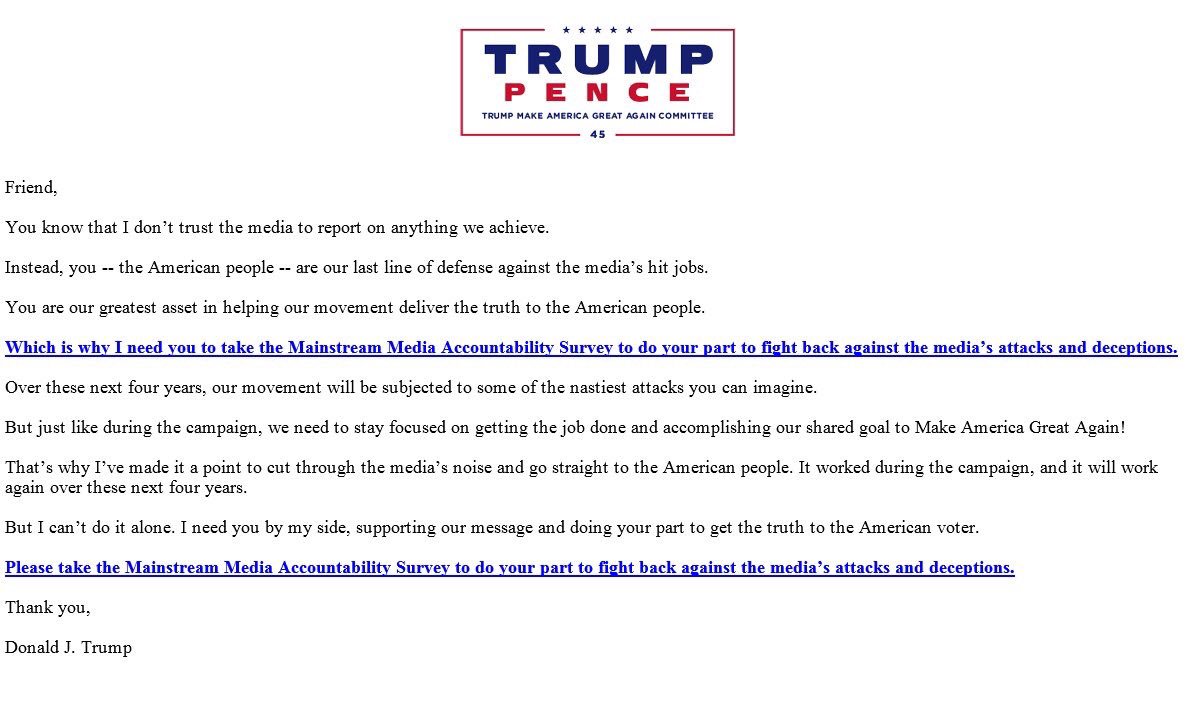 Trump asks voters to take his "mainstream media accountability survey" to show how much they hate the media, then sends out a new survey when the first one doesn't go his way.