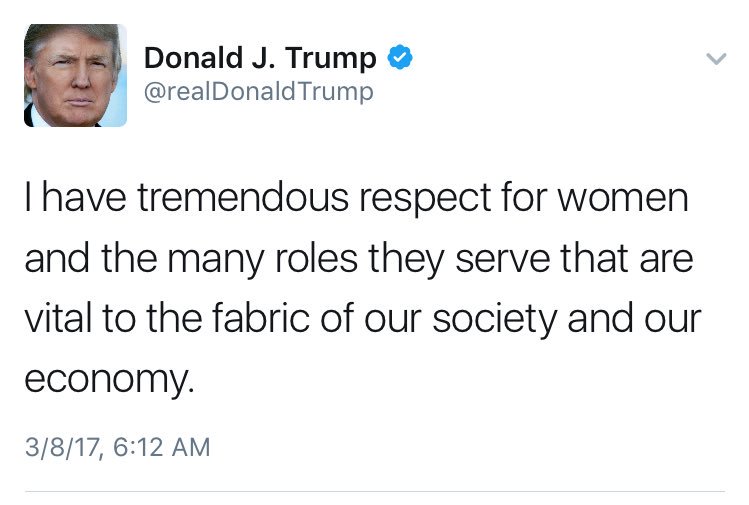 - respects women and minorities. Because when he says "No one respects woman more than I do. Believe me." We have to believe him. Fuck that.kona