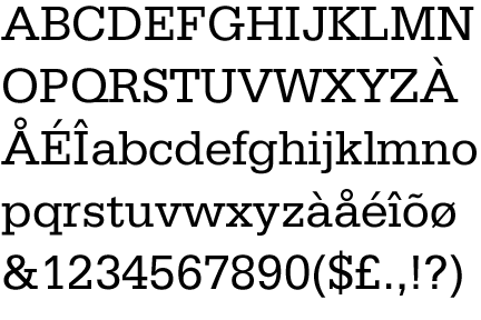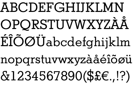 I'm looking for a good slab serif with an open and modern feeling, with boxy slabs, and a low stroke contrast. It's for a restaurant, for display/title/subhead use, but not body copy. I think I've settled on...