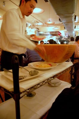 Italian restaurant in nyc called Basta Pasta tosses the spaghetti up in a big wheel of parmesan. (Not my photo but the food was killer.)