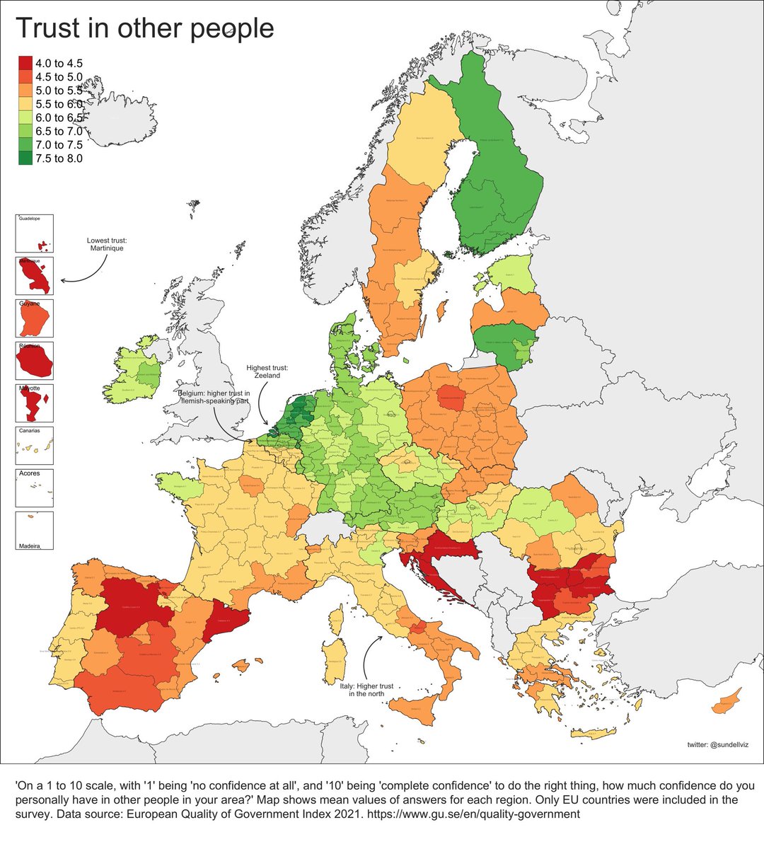 "EU citizens' answers to a question of whether they trust people in the area to "do the right thing". Highest trust in the Netherlands and Finland, lowest in Croatia and Bulgaria. In Belgium, large differences along the language divide. #dataviz"