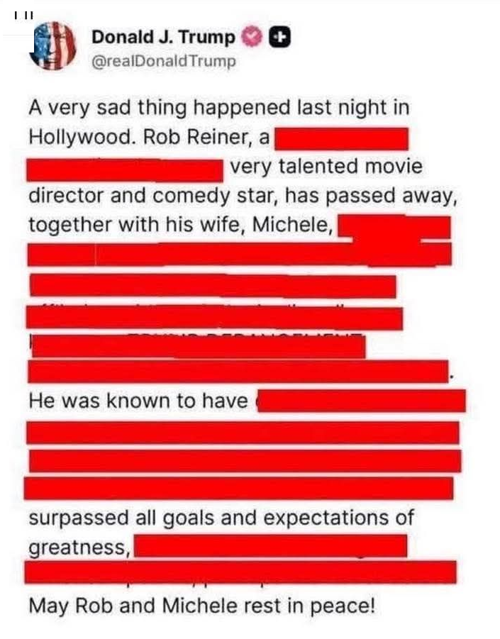 Trump wrote in a post on Truth Social: “A very sad thing happened last night in Hollywood. Rob Reiner, a tortured and struggling, but once very talented movie director and comedy star, has passed away, together with his wife, Michele, reportedly due to the anger he caused others through his massive, unyielding, and incurable affliction with a mind crippling disease known as TRUMP DERANGEMENT SYNDROME, sometimes referred to as TDS.”