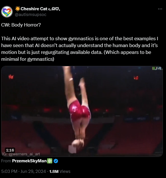 This AI video attempt to show gymnastics is one of the best examples I have seen that AI doesn’t actually understand the human body and it’s motion but is just regurgitating available data. (Which appears to be minimal for gymnastics)