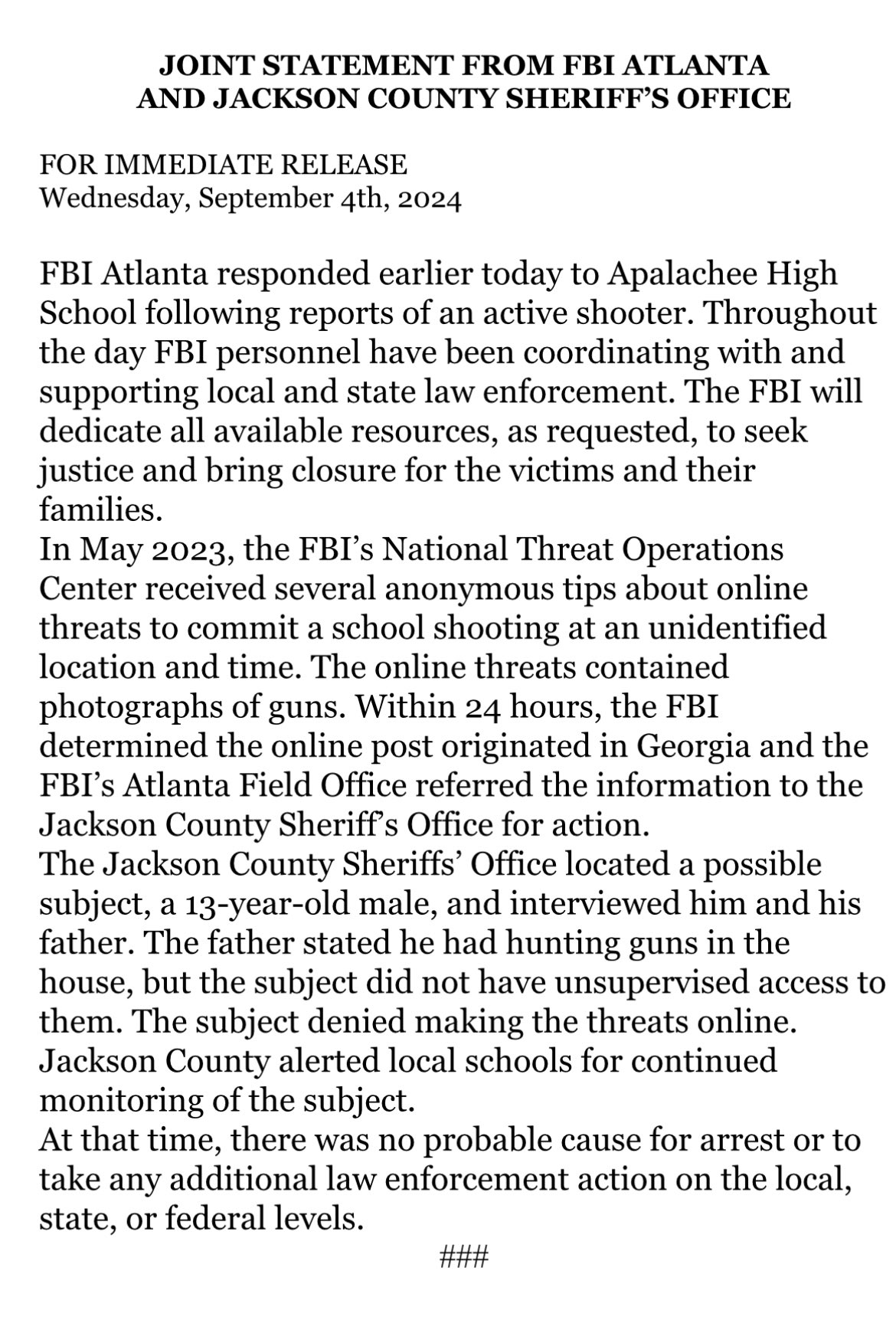 Georgia Governor Brian Kemp tweeted his condolences and asked for "all Georgians" to join in praying for the safety of students in classrooms. Georgia Representative Mike Collins, whose congressional district includes the school, issued a statement offering prayers for the victims and their families. The mayor of Atlanta Andre Dickens offered his thoughts and prayers to those affected as well as support to responding law enforcement.
