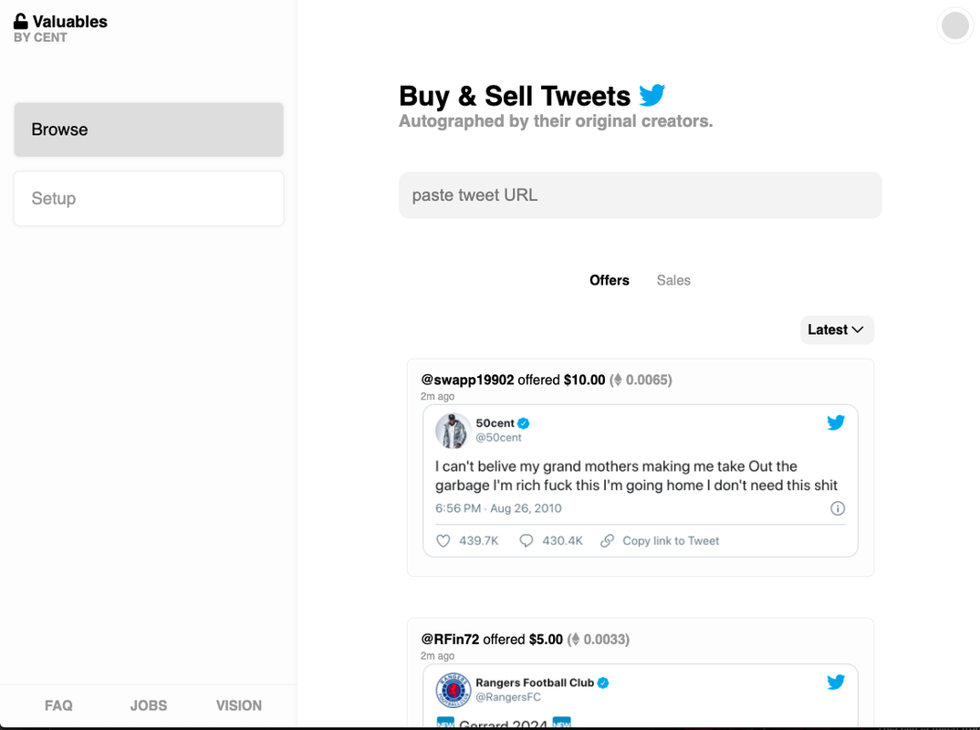 "Twitter co-founder and CEO Jack Dorsey has listed for sale on the NFT platform Valuables the first tweet ever made. As of press time, bidding was at $88,888."